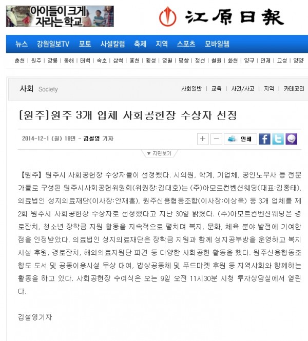 [원주]원주 3개 업체 사회공헌장 수상자 선정 페이지 정보 언론사 성지병원운영자 작성일14-12-11 09:18 조회2,792회 댓글0건 관련링크 이전글 다음글 목록 본문 원주시 사회공헌장 수상자 선정 댓글목록 등록된 댓글이 없습니다. 이전글 다음글 목록