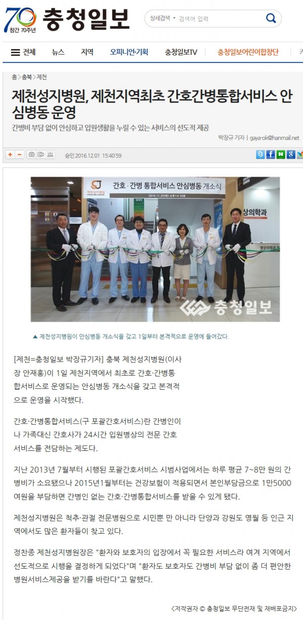 제천성지병원, 제천지역최초 간호간병통합서비스 안심병동 운영 페이지 정보 언론사 성지병원운영자 작성일16-12-06 17:26 조회2,616회 댓글0건 관련링크 이전글 다음글 목록 본문 제천성지병원, 제천지역최초 간호간병통합서비스 안심병동 운영 댓글목록 등록된 댓글이 없습니다. 이전글 다음글 목록