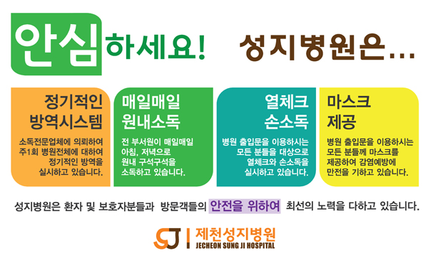 환자안전을 위한 예진 시행 페이지 정보 작성자 성지병원운영자 작성일15-06-29 17:16 조회6,082회 댓글0건 관련링크 이전글 다음글 목록 답변 본문 제천성지병원은 지난 4일부터 환자 및 보호자의 안전을 위하여 모든 방문객을 대상으로 예진을 시행하고 있습니다. 댓글목록 등록된 댓글이 없습니다. 이전글 다음글 목록 답변