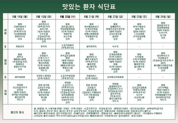 2025년 8월 4주차 <맛있는 환자 식단표> (´。• ◡ •。`) 페이지 정보 작성자 최고관리자 작성일25-08-18 09:11 조회287회 댓글0건 관련링크 이전글 다음글 목록 본문 댓글목록 등록된 댓글이 없습니다. 이전글 다음글 목록