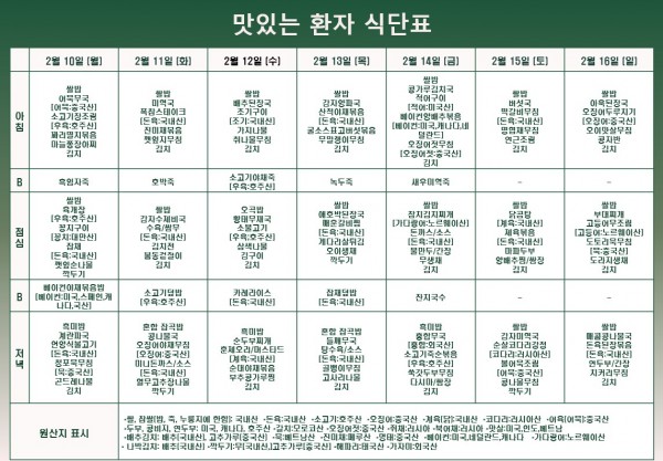 2025년 2월 3주차 <맛있는 환자 식단표> (´。• ◡ •。`) 페이지 정보 작성자 최고관리자 작성일25-02-10 09:26 조회598회 댓글0건 관련링크 이전글 다음글 목록 본문 댓글목록 등록된 댓글이 없습니다. 이전글 다음글 목록