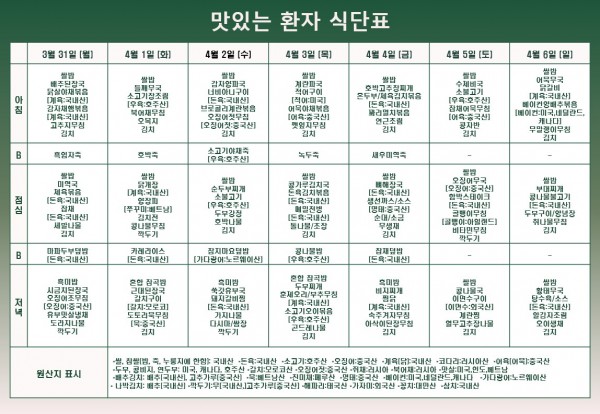 2025년 4월 1주차 <맛있는 환자 식단표> (´。• ◡ •。`) 페이지 정보 작성자 최고관리자 작성일25-03-31 08:42 조회496회 댓글0건 관련링크 이전글 다음글 목록 본문 댓글목록 등록된 댓글이 없습니다. 이전글 다음글 목록