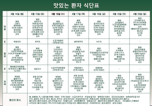 2025년 4월 3주차 <맛있는 환자 식단표> (´。• ◡ •。`) 페이지 정보 작성자 최고관리자 작성일25-04-14 09:02 조회491회 댓글0건 관련링크 이전글 다음글 목록 본문 댓글목록 등록된 댓글이 없습니다. 이전글 다음글 목록