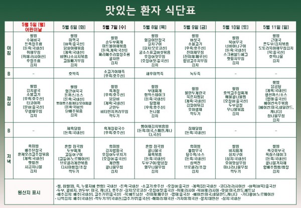2025년 5월 2주차 <맛있는 환자 식단표> (´。• ◡ •。`) 페이지 정보 작성자 최고관리자 작성일25-05-06 10:27 조회461회 댓글0건 관련링크 이전글 다음글 목록 본문 댓글목록 등록된 댓글이 없습니다. 이전글 다음글 목록