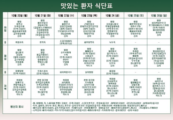 2025년 10월 4주차 <맛있는 환자 식단표> (´。• ◡ •。`) 페이지 정보 작성자 최고관리자 작성일25-10-20 10:54 조회135회 댓글0건 관련링크 이전글 다음글 목록 본문 댓글목록 등록된 댓글이 없습니다. 이전글 다음글 목록