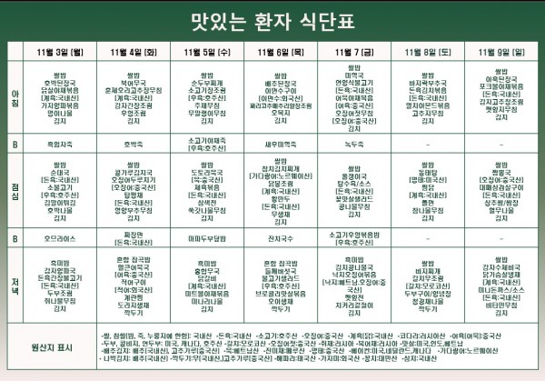 2025년 11월 1주차 <맛있는 환자 식단표> (´。• ◡ •。`) 페이지 정보 작성자 최고관리자 작성일25-11-03 11:43 조회164회 댓글0건 관련링크 이전글 다음글 목록 본문 댓글목록 등록된 댓글이 없습니다. 이전글 다음글 목록
