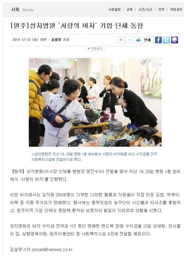 [원주]성지병원 '사랑의 바자' 기업,단체 동참 페이지 정보 언론사 성지병원운영자 작성일14-12-23 16:27 조회3,143회 댓글0건 관련링크 이전글 다음글 목록 본문 [원주]성지병원 '사랑의 바자' 기업,단체 동참 - 강원일보 댓글목록 등록된 댓글이 없습니다. 이전글 다음글 목록