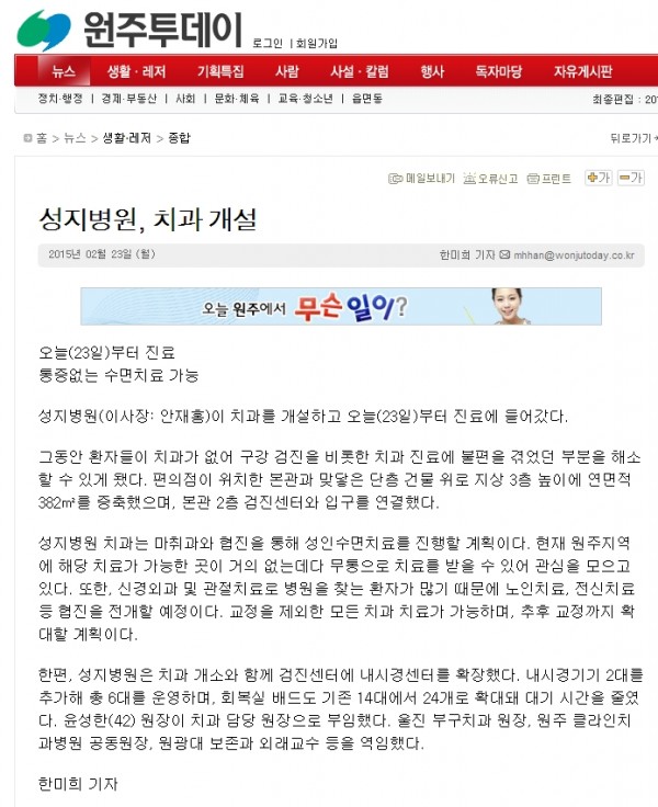원주성지병원, 치과개설 페이지 정보 언론사 성지병원운영자 작성일15-02-23 18:04 조회3,437회 댓글0건 관련링크 이전글 다음글 목록 본문 원주성지병원, 치과개설 댓글목록 등록된 댓글이 없습니다. 이전글 다음글 목록