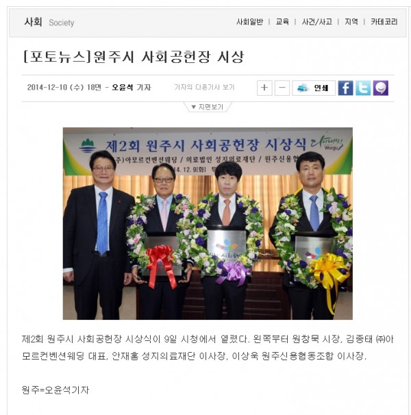 원주시 사회공헌장 시상 페이지 정보 언론사 성지병원운영자 작성일14-12-11 09:21 조회2,814회 댓글0건 관련링크 이전글 다음글 목록 본문 원주시 사회공헌장 시상 댓글목록 등록된 댓글이 없습니다. 이전글 다음글 목록