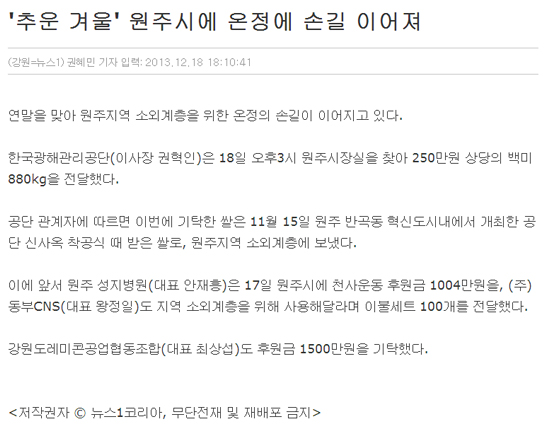 '추운겨울' 원주시에 온정에 손길 이어져 페이지 정보 언론사 성지병원운영자 작성일14-02-13 16:28 조회2,796회 댓글0건 관련링크 이전글 다음글 목록 본문 '추운겨울' 원주시에 온정에 손길 이어져 댓글목록 등록된 댓글이 없습니다. 이전글 다음글 목록