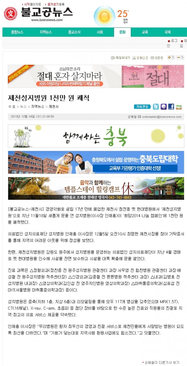 제천성지병원 1천만 원 쾌척 페이지 정보 언론사 성지병원운영자 작성일13-12-06 10:36 조회2,743회 댓글0건 관련링크 이전글 다음글 목록 본문 제천성지병원 1천만 원 쾌척 댓글목록 등록된 댓글이 없습니다. 이전글 다음글 목록