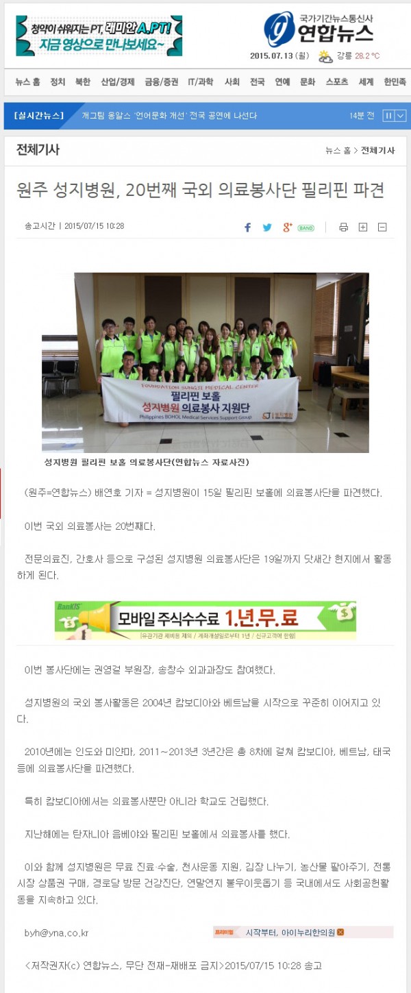 원주 성지병원, 20번째 국외 의료봉사단 필리핀 파견 페이지 정보 언론사 성지병원운영자 작성일15-07-16 09:37 조회2,912회 댓글0건 관련링크 이전글 다음글 목록 본문 원주 성지병원, 20번째 국외 의료봉사단 필리핀 파견 댓글목록 등록된 댓글이 없습니다. 이전글 다음글 목록