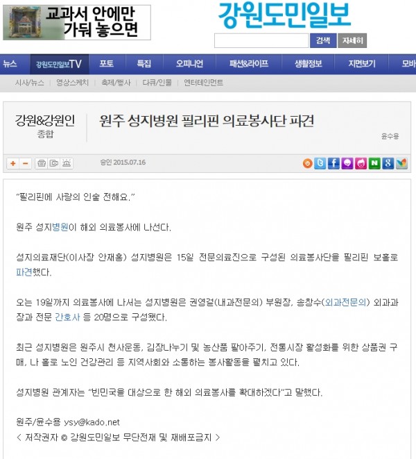 원주 성지병원 필리핀 의료봉사단 파견 페이지 정보 언론사 성지병원운영자 작성일15-07-16 09:38 조회2,881회 댓글0건 관련링크 이전글 다음글 목록 본문 원주 성지병원 필리핀 의료봉사단 파견 댓글목록 등록된 댓글이 없습니다. 이전글 다음글 목록