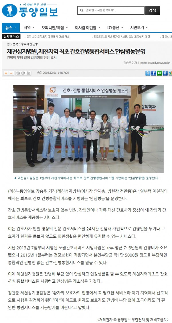 제천성지병원, 제천지역 최초 간호간병통합서비스 '안심병동'운영 페이지 정보 언론사 성지병원운영자 작성일16-12-06 17:52 조회2,634회 댓글0건 관련링크 이전글 다음글 목록 본문 제천성지병원, 제천지역 최초 간호간병통합서비스 '안심병동'운영 댓글목록 등록된 댓글이 없습니다. 이전글 다음글 목록