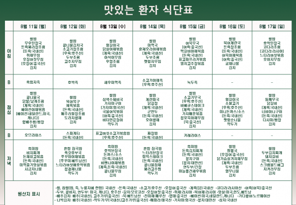 2025년 8월 3주차 <맛있는 환자 식단표> (´。• ◡ •。`) 페이지 정보 작성자 최고관리자 작성일25-08-11 09:06 조회309회 댓글0건 관련링크 이전글 다음글 목록 본문 댓글목록 등록된 댓글이 없습니다. 이전글 다음글 목록