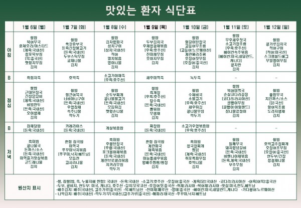 2025년 1월 2주차 <맛있는 환자 식단표> (´。• ◡ •。`) 페이지 정보 작성자 최고관리자 작성일25-01-06 10:54 조회624회 댓글0건 관련링크 이전글 목록 본문 댓글목록 등록된 댓글이 없습니다. 이전글 목록