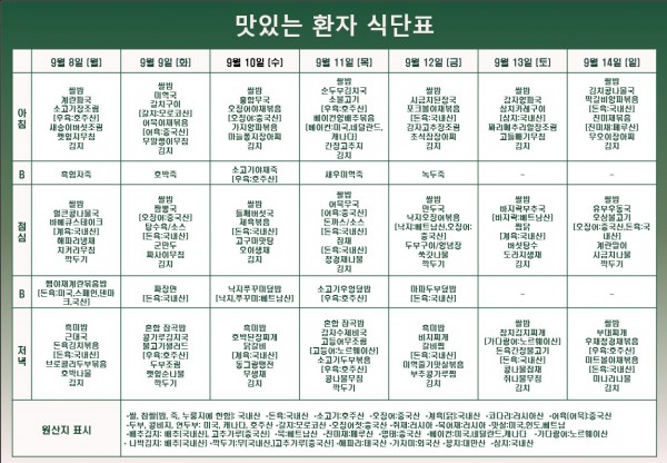 2025년 9월 2주차 <맛있는 환자 식단표> (´。• ◡ •。`) 페이지 정보 작성자 최고관리자 작성일25-09-08 10:57 조회233회 댓글0건 관련링크 이전글 다음글 목록 본문 댓글목록 등록된 댓글이 없습니다. 이전글 다음글 목록