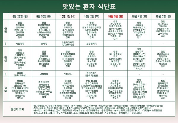 2025년 10월 1주차 <맛있는 환자 식단표> (´。• ◡ •。`) 페이지 정보 작성자 최고관리자 작성일25-09-30 11:04 조회154회 댓글0건 관련링크 이전글 다음글 목록 본문 댓글목록 등록된 댓글이 없습니다. 이전글 다음글 목록