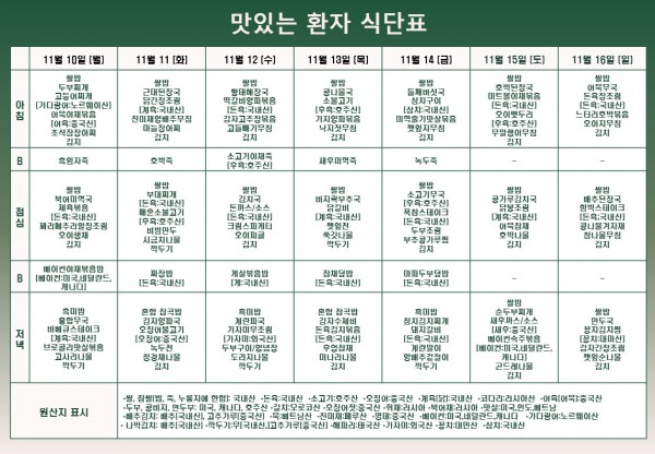 2025년 11월 2주차 <맛있는 환자 식단표> (´。• ◡ •。`) 페이지 정보 작성자 최고관리자 작성일25-11-10 09:50 조회117회 댓글0건 관련링크 이전글 다음글 목록 본문 댓글목록 등록된 댓글이 없습니다. 이전글 다음글 목록