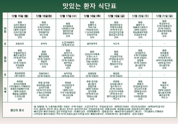 2025년 12월 3주차 <맛있는 환자 식단표> (´。• ◡ •。`) 페이지 정보 작성자 최고관리자 작성일25-12-15 08:49 조회43회 댓글0건 관련링크 다음글 목록 본문 댓글목록 등록된 댓글이 없습니다. 다음글 목록